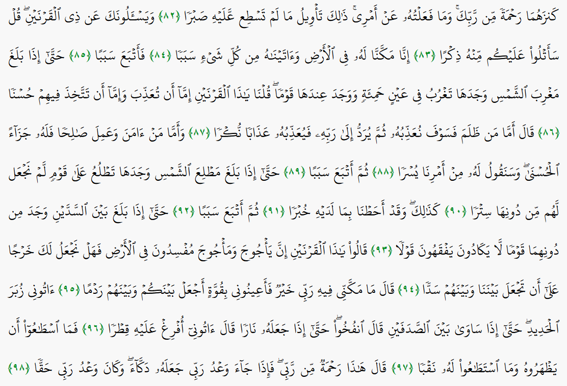 يصف القرآن ذو القرنين كقائد مُمكَّن في الأرض، ومع ذلك لم يكن طاغية، بل جسّد العدل والرحمة: (( قَالَ أَمَّا مَن ظَلَمَ فَسَوْفَ نُعَذِّبُهُ، ثُمَّ يُرَدُّ إِلَى رَبِّهِ فَيُعَذِّبُهُ عَذَابًا نُّكْرًا، وَأَمَّا مَنْ آمَنَ وَعَمِلَ صَالِحًا فَلَهُ جَزَاءً الْحُسْنَى)) (الكهف: 87-88).