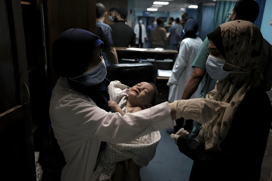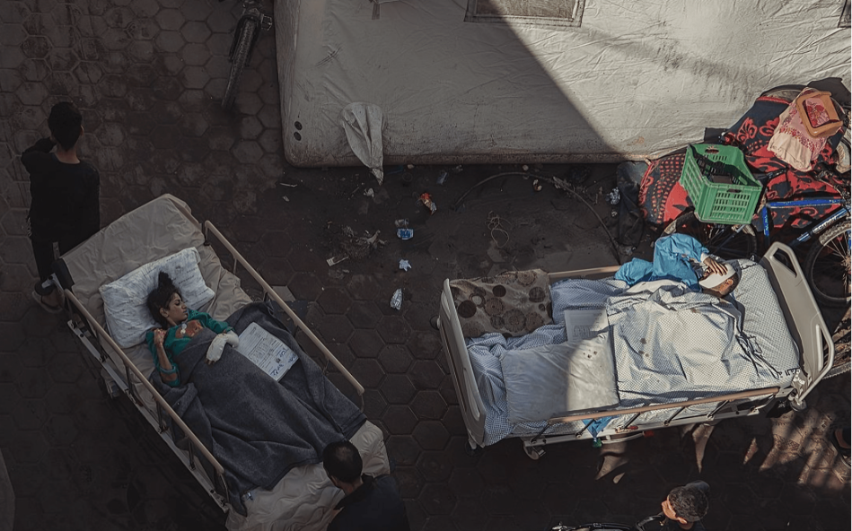 على أرضية باردة في أحد مستشفيات مدينة غزة، يرقد طفل صغير من شمال القطاع وقد فَقَد نصف جمجمته بعد أن مزقت شظية حربية رأسه الصغير. كان من المفترض أن ينام هذا الطفل على سرير في قسم العناية المركزة، لكن المستشفى المتهالك لا يملك له سريرًا ولا تجهيزات طبية كافية لرعايته. تحت ضغط الأعداد الهائلة من الجرحى، اضطر الأطباء إلى إخلاء سريره لصالح حالة أخرى أشد حرجا، وأُجبر الطفل على مغادرة جناح العلاج ليستلقي على الأرض في خيمة مؤقتة خارج المستشفى. هناك تفترش والدته الأرض بجواره، تمسح العرق عن جبينه العليل، عاجزةً عن فعل أي شيء آخر لتخفيف ألمه.